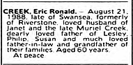 Eric died on 21/08/1988 in Swansea.