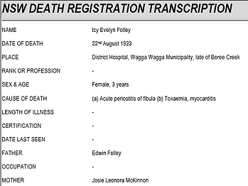 Icy died in Wagga Wagga on 22/08/1923, cause of death “(a) Acute periostitis of fibula (b) Toxaemia, myocarditis”.