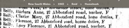 She was a teacher and resided with the family. In 1943 the 3 sister and their mother are listed living at 27 Abbotsford Rd, Homebush.