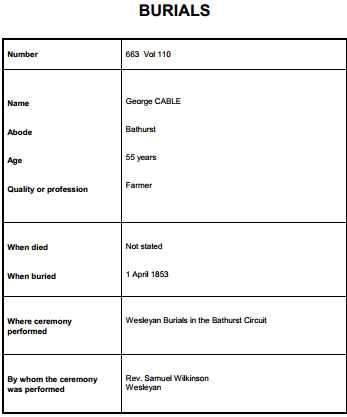 He is buried, as George Cable, on 01/04/1853 at Wesleyan in the Bathurst Circuit.