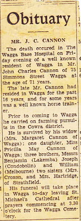 John died in Wagga Wagga on 29/10/1954 and is buried on 01/11/1954 at Wagga Cemetery.