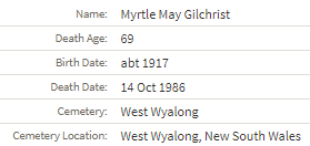 Myrtle died on 14/10/1986 and is buried in West Wyalong.