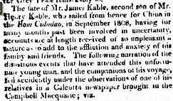 The fate of Mr. James Kable second son of Mr. Henry Kable, who sailed from hence to China in the “Bom Cidaldao” in September 1808, having for many months past been involved in uncertainty, accounts are at length received of so upleasant a nature as to add to the disastrous events that have attended this unfortunate young man, and the companions of his voyage, fell accidently under the observations of one of his relatives in a calcutta newspaper brought in the “Campbell Macquarie”