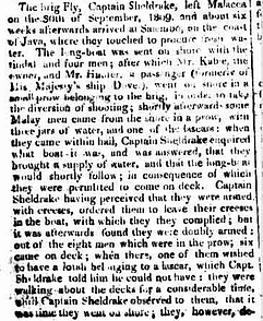 “The brig Fly” captain Sheldrake, left Malacca on the 30th September 1809 about 6 weeks afterwards arrived at Salembo, on the coast of Java, where they touched and procure fresh water. The long boat was sent on shore with the tindal and four men, after which Mr. Kable, the owner, and Mr. Hunter, a passenger (foremerly of His majesty’s ship Dover) went on shore in a small prow belonging to the brig, in order to take the diversion of shooting, shortly afterwards some Malay men came from the shore in a prow, with 3 jars of water, and one of the lascars; when they came within hail, Captain Sheldrake enquired what boat it was, and was answered, that they brought a supply of water, and that the long-boat would shortly follow; in consequence of which they were permitted to come on deck. Captain Sheldrake having perceived that they were armed with creeses, ordered them to leave their creeses in the boat, with whick they complied; but it was afterwards found that they were doubly armed; out of the eight men which were in the prow, 6 came on deck; when there, one of them wished to have a loiah belonging to a lascar, which Captain Sheldrake told him he could not have; they were walking about the decks a considerable time, until Captain Sheldrake observed to them, that it was time they went on shore; they, however, delayed for some time, and the gunner was ordered to keep the hatches close;- An old man with a long beard, who appeared to be the head of the party, wished to go below, which the gunner endeavouring to prevent, he immediately creesed him; on hearing the cries of the gunner, and perceiving his having been creesed, Captain Sheldrake jumped overboard, and never rose again; he was followed by his servants, a Portuguese Malacca boy named George, and a Chinese named Akini; who however, cought hold of the stem of the brig; the Malays asked them if they preferred to live or die, and, they, accordingly, together with the whole of the Lascars, begged for their lives;- so soon as the capture had been accomplished, 3 large boats, with a number of smaller ones, came off, and commenced plundering; they were 4 days discharging the cargo; during which time, they took out the straw in which the beer, wine ect. were packed, and distriputed it in several parts of the vessel, with the intention evidently of setting fire to her; fortunately however, for them, a heavy squall came on at night, when they out the cable and scaped; they reached Semanap, on the east end of Madura, where she was siezed as a prize, and taked to Sooroobaya, and sold at public auction, on account of the Dutch Government.