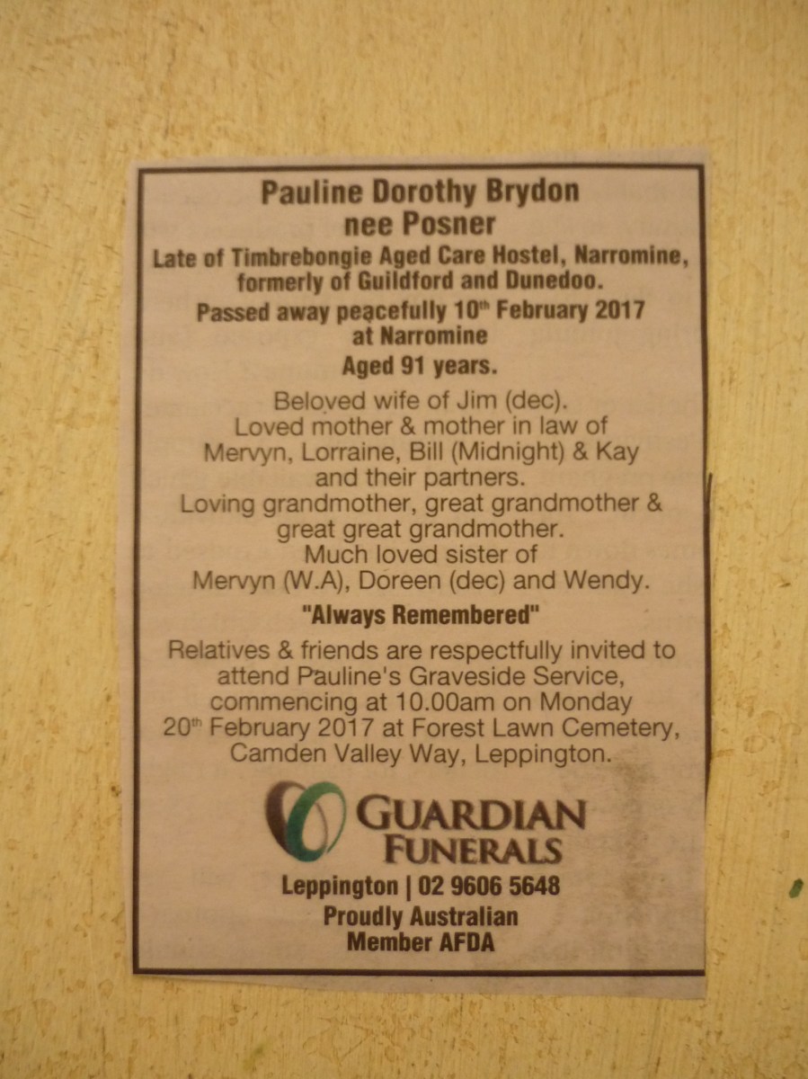 Pauline Brydon (nee Posner) Obituary Notice Published September 7, 2018 at 2448 × 3264 in Lilly Kable (1899 – 1970) ← Previous Next → Like Loading...