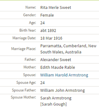 She married to William Harold Armstrong in Parramatta on 18/03/1916. William was born on 13/12/1891 in Newtown.