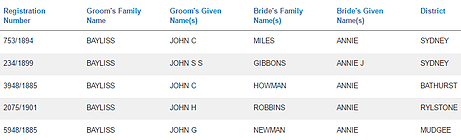 Between 1885 and 1901 5 marriages took place between a John Bayliss and an Annie.
