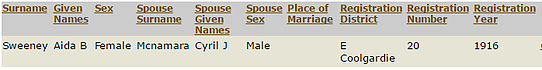 She married to Cyril J Mcnamara in 1916 in East Coolgardie WA. Cyril was born in 1893 in NSW and died in 1920 in Perth.