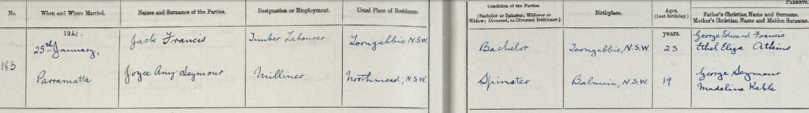 She married in St Johns, Parramatta on 25/01/1941 to Jack Francis. Jack was born in 1918.