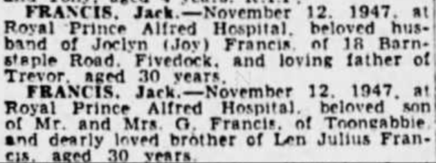Jack died on 12/11/1947 at Royal Prince Albert Hospital in Sydney.
