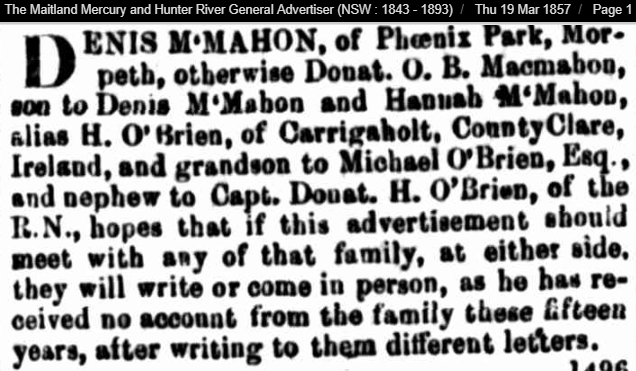 For this purpose, the use of DNA Testing has enabled the Y links for the McMahon O’Brien line to be researched. Tying down this part of story; the escape from the Irish Famines and the growth of a new dynasty in Australia was spring boarded with a breakthrough moment, for the MACMAHON/OBRIEN research, coming via the National Library of Australia’s TROVE DIGITAL NEWSPAPER RECORDS, where an 1857 advertisement placed by Denis McMahon of County Clare reads as follows:
